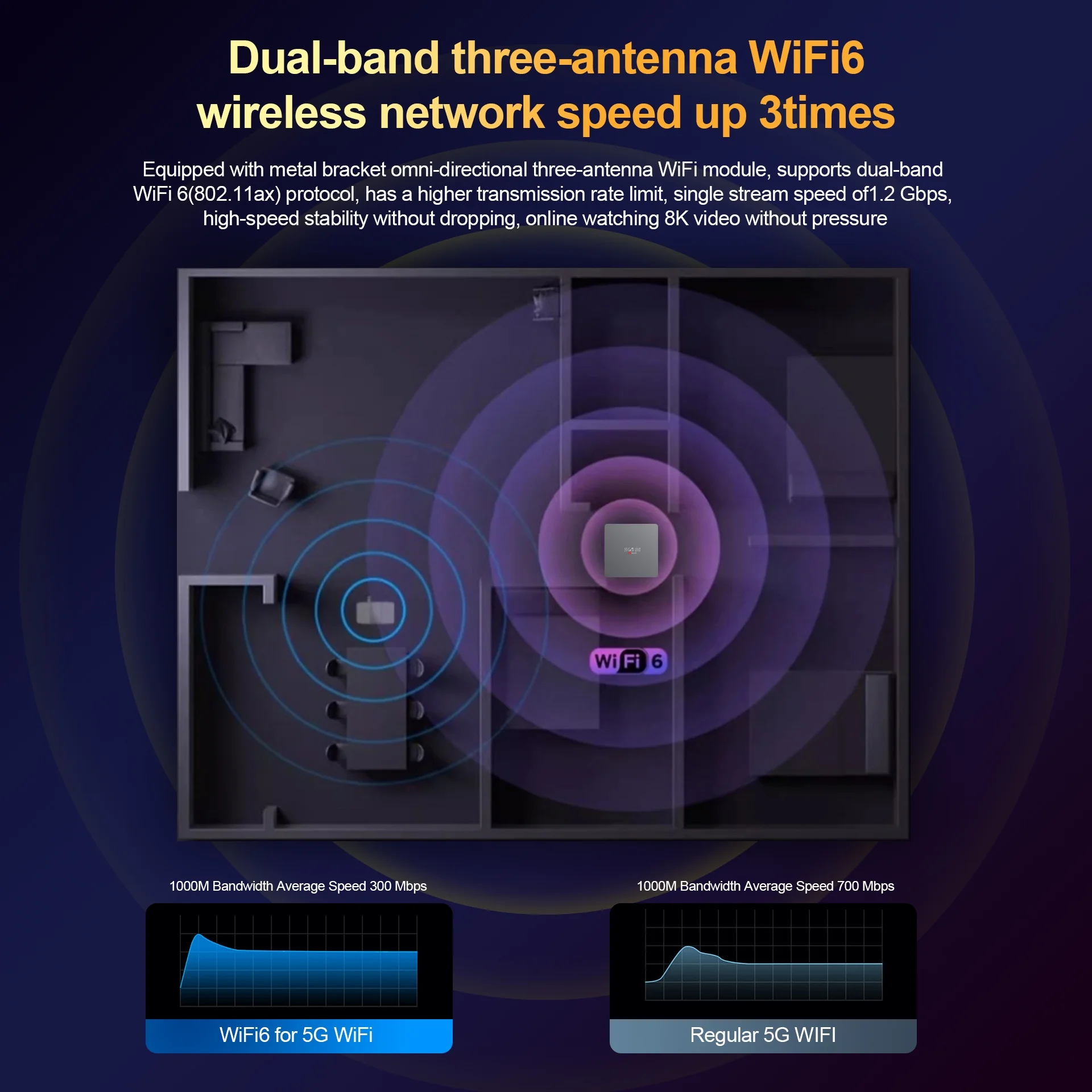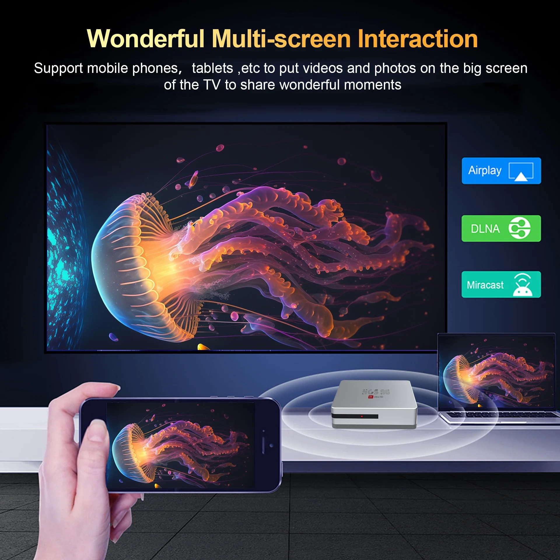 HCS96 Streaming device | Android TV Box, OS Android 13 Support 4K HDR Streaming Media Player. This HCS96 TV Box gives you a smarter, easier way to get more from your TV, and perfect for home entertainment, home theater, and business use. You can enjoy a high-definition video and audio experience by connecting to your TV via HDMI. The device has 4GB RAM and 64GB ROM storage, enough space to store your favorite apps, games, and media files—ultra-high-definition 4K resolution with a new generation of HDR 10+ image quality engine. Rich details display to let you see the world more clearly 8K video decoding engine is supported, which brings you more exciting content.