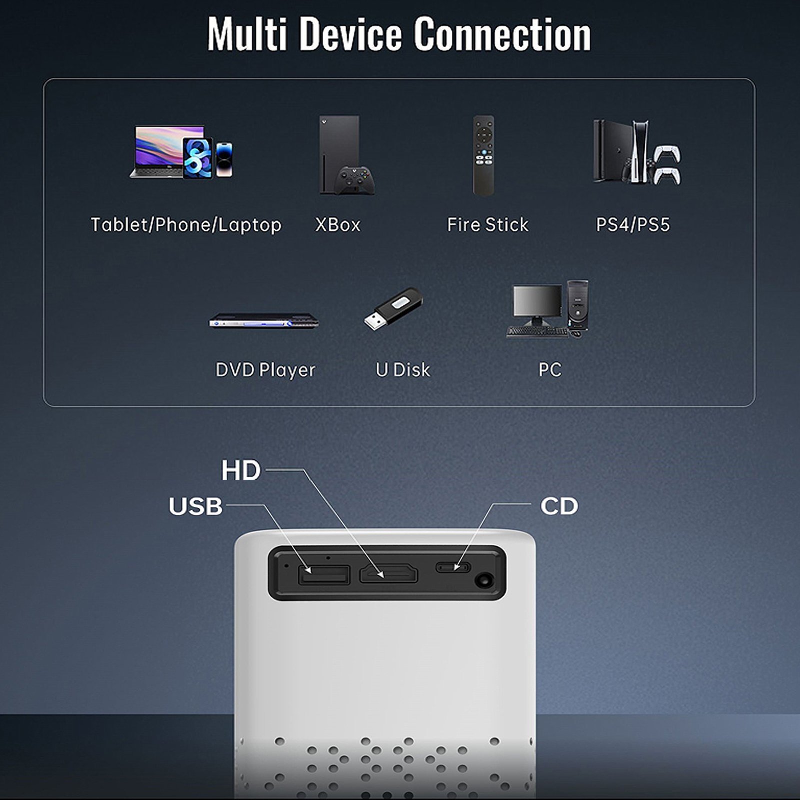 Prenant en charge le WiFi double bande 2,4G et 5G, le projecteur assure une connexion sans fil ultra-rapide et stable.Il est doté d’une fonctionnalité d’affichage WiFi intégrée, vous permettant de refléter facilement du contenu, tels que des applications, des listes de musique, des jeux mobiles et des flux sportifs, depuis n’importe quel appareil Android ou Apple jusqu’au projecteur.