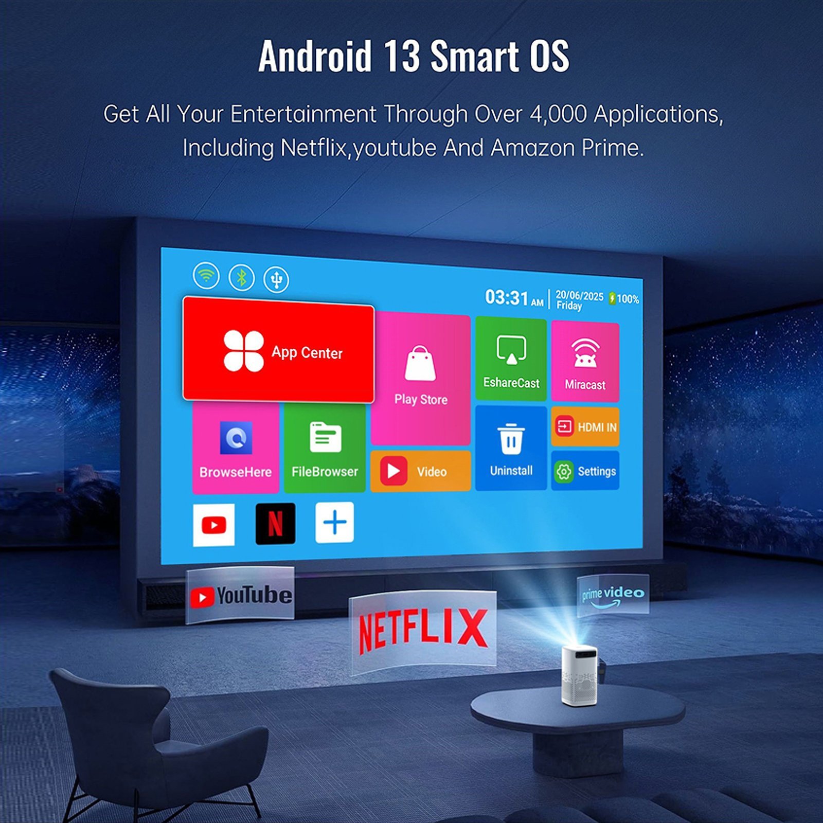 Alimenté par le système d’exploitation intelligent Android 13, ce projecteur libère l’accès à plus de 4 000 applications, y compris les plateformes de streaming populaires telles que Netflix, YouTube et Amazon Prime.L’interface conviviale facilite la navigation, la recherche et le téléchargement d’applications.